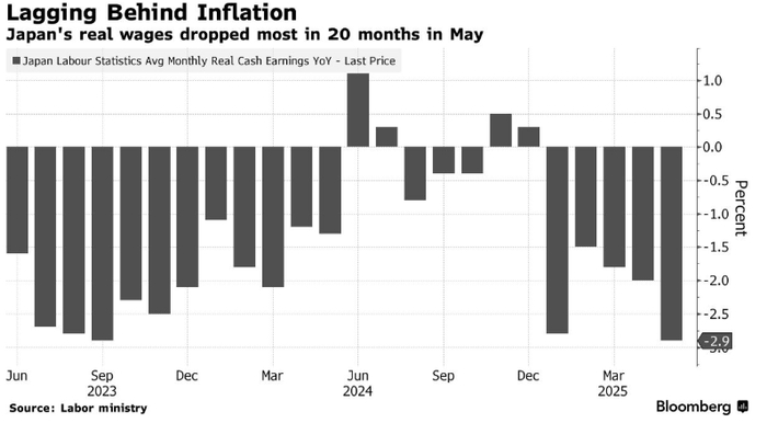 实际薪资超预期急跌凸显日本通胀强劲扩张,为少数执政联盟在参议院选举前增添压力。随着物价仍快于日本薪资涨幅,公众不满情绪加剧,迫使政界拿出更有说服力的民生纾困方案。