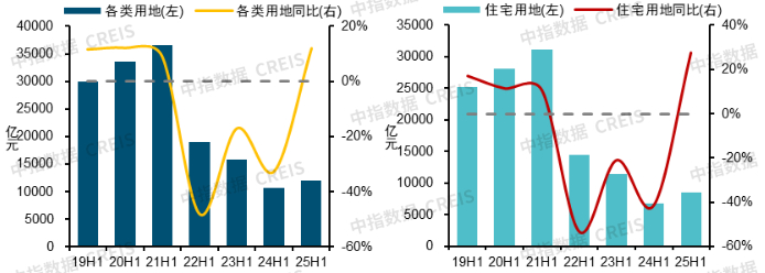 各类用地:根据中指数据,2025年上半年,300城各类用地推出规划建筑面积为10.8亿平方米,同比下降11.6%,成交9.3亿平方米,同比下降7.7%。出让金方面,2025年上半年,300城各类用地出让金1.2万亿元,同比增长11.9%。