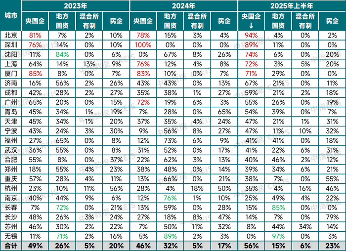 表:22城2023年-2025上半年涉宅用地不同企业拿地金额占比情况(市本级)