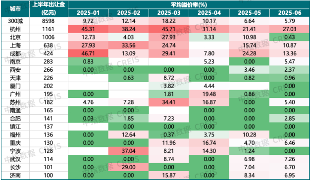 表:2025年上半年出让金超百亿城市平均溢价率变化(全市)