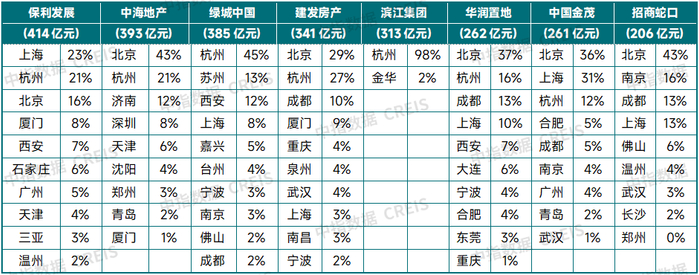 表:2025年上半年拿地超200亿房企布局前十城市占比