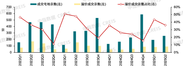 土拍热度方面,房企拿地进一步聚焦影响下,核心城市优质地块竞争加剧。根据中指数据,2025年上半年,22个重点城市住宅用地溢价成交占比39.2%,较去年同期提升8.9个百分点,二季度以来土拍情绪有所走弱,溢价成交占比为36.1%,较一季度下跌7.2个百分点。
