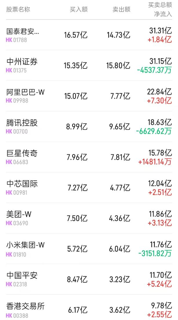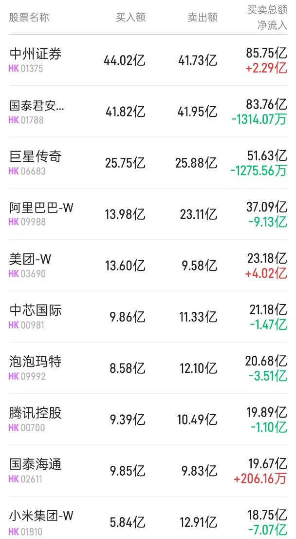 此外,中芯国际(00981)、巨星传奇(06683)分别获净买入1.03亿、205万港元。而腾讯(00700)遭净卖出1.76亿港元。