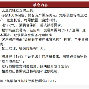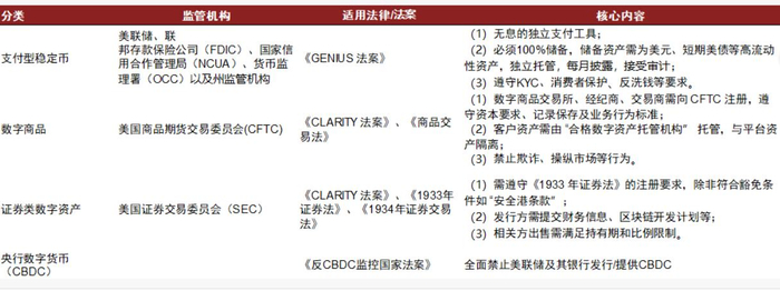 此前我们在《稳定币:从支付工具到RWA生态构建》中分析了《GENIUS 法案》的背景、核心内容及监管导向。此次我们重点分析《CLARITY 法案》和《反CBDC监控国家案》的核心内容,并总结美国对数字资产的监管路径选择和其潜在影响。