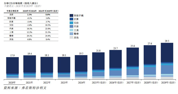 就拿CIS来说,根据弗若斯特沙利文的资料,全球CIS市场将由2020年的179亿美元增加到2024年的195亿美元,期间对应年复合增长率为2.2%。而在新技术催化等多因素共同作用下,预计该市场在2029年将达到295亿美元,未来几年的年复合增长率将达到8.6%,潜在增速显著高于前几年。
