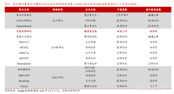 此外,国内还有康乃德/先声乐德奇拜单抗(CBP-201),智翔金泰,麦济、恒瑞医药(SHR-1819),三生国健(SSGJ-611)和康方(AK120)等多家公司针对IL-4Rα靶点在AD等领域进行开发,但无论是开发进度,还是临床效果,目前来看对比CM310均处于劣势。乐德奇拜单抗(CBP-201)刚刚提交上市申请,其它IL-4Rα类单抗仍处于临床三期。