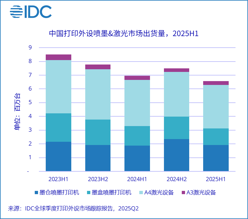 IDC最新发布的《中国打印外设市场季度跟踪报告(2025第二季度)》显示2025年上半年,中国打印外设市场喷墨及激光品类产品出货总量为656.4万台,同比下降5.5%。其中喷墨打印产品出货量311.5万台,同比下降5.6%;A4激光设备出货量317.7万台,同比下降5.0%;A3激光设备出货量27.2万台,同比下降10.0%。虽然国家推行了“国补”等政策,希望拉动市场的需求回暖,但从市场反应来看,购买力的回升并不明显,整体市场继续下滑。