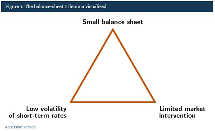 美联储经济学家写道:“这一‘不可能三角’凸显出,中央银行必须决定在何种程度上,通过资产负债表规模来吸收流动性变化,还是通过频繁的市场干预进行管理,亦或是允许其导致利率波动。”