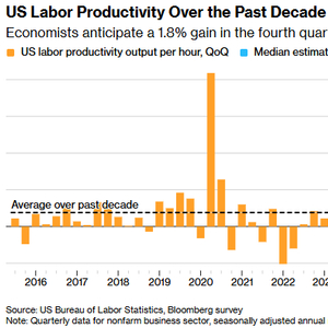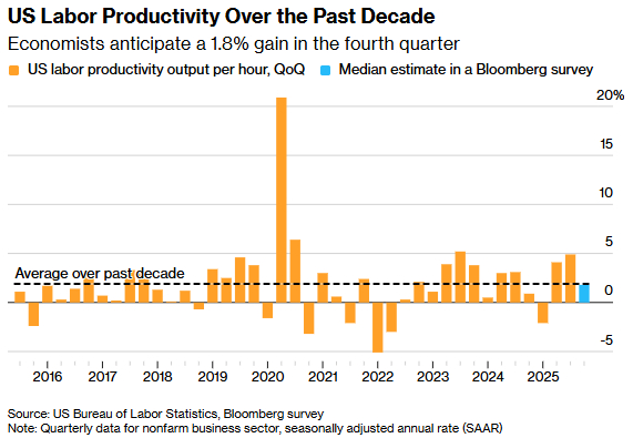 而近期,劳动生产率的确大幅飙升。过去50年间,非农雇员每小时产出季度环比年化增长率平均为1.9%。而过去10个季度,这一均值达到2.7%,2025年第三季度更触及4.9%。