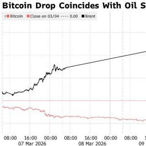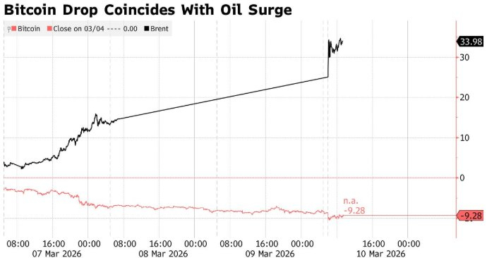 由于伊朗战争升级导致油价飙升,比特币在亚洲早盘交易中跌至一周以来的最低点。受通胀担忧引发的避险情绪推动,比特币周一一度下跌2.36%,至65,633美元,与此同时,布伦特原油价格飙升至每桶118.73美元,创下2022年6月以来的最高水平。