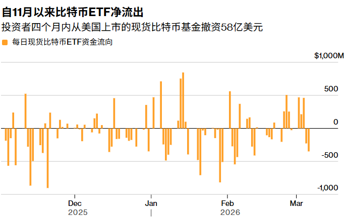 整体市场情绪依然悲观,上周末ETF资金流动再次转为负值。数据显示,自去年11月以来,在美国上市的现货比特币ETF已累计净流出近60亿美元。Hughes表示,这表明机构资本仍在持续撤离,而不是继续观望。