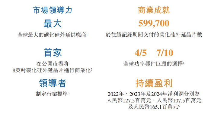 据招股书,瀚天天成是全球碳化硅(SiC)外延行业的领导者。公司主要从事用于制造碳化硅半导体器件的碳化硅外延芯片、组件的研发、量产及销售。瀚天天成的客户运用公司的碳化硅外延芯片制造功率器件,广泛应用于电动汽车、充电基建、可再生能源、储能系统等下游应用。根据灼识咨询的报告,自2023年来,按年销售片数计,瀚天天成是全球最大的碳化硅外延供货商,2024年的市场份额超过30%。