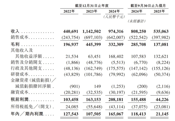 财务方面,于2022年度、2023年度、2024年度、2025年度截至9月30日止九个月,瀚天天成收入分别约4.41亿元、11.43亿元、9.74亿元、5.35亿元人民币;同期,年内/期内利润分别约为1.28亿元、1.08亿元、1.65亿元、0.21亿元人民币。