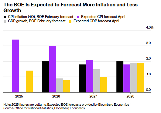 英国央行2月的经济预测曾预判,经济将温和增长,且今年春季通胀将回落至2%的政策目标附近,但最新预测或将彻底改写这一前景。