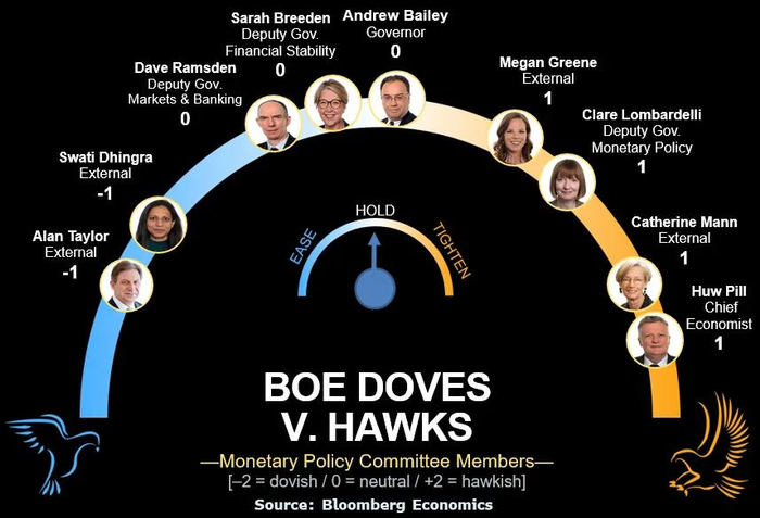 Pill被视为最有可能呼吁立即采取行动的人,因为他近期曾警告不要采取“等待观望”的策略。副行长Clare Lombardelli和外部委员Megan Greene和Catherine Mann此前均持鹰派立场,受地缘局势影响,此次也有可能转向支持加息。