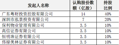 智通财经查阅相关信息显示,粤财控股将认购14亿股,持股占比40%,为粤港证券第一大股东;泓景投资认购7亿股,持股占比20%;保利物业、高信证券、恒明珠证券、伟禄美林证券均认购3.5亿股,持股占比均为10%。值得一提的是,粤财控股为国有独资公司,实际控制人广东省人民政府。