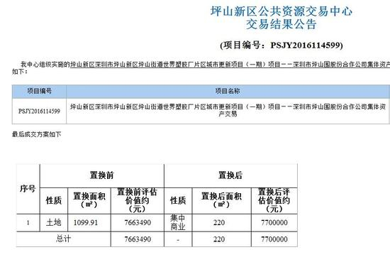 按照2016年9月8号坪山新区公共资源交易中心交易结果公告(项目编号:PSJY2016114599),深圳最大的城改项目之一,深圳市坪山新区坪山街道世界塑胶厂片区城市更新项目开发商花样年与村民达成的交易:坪山项目建成后物业估值为每平米35000人民币,花样年赔偿地价成本仅1/5。该项目位于万科金域东郡附近,万科金域上周的成交价超过40000人民币。