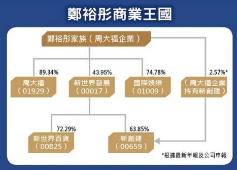 2015年12月21日,郑裕彤私人持股出现大变动,其名下6家上市公司股份,全部转于郑裕彤家族基金及周大福有限公司等,以当时收市价计算,涉及金额38亿港元。其中,郑裕彤将名下包括佐丹奴(00709)、盛京银行(02066)、蒙古能源、综合环保(00923)、新昌营造(00404)及新时代能源(00166),全部持股清零,同时,周大福资本则增加相同的股数。周大福资本既是郑裕彤家族所有的公司,也是新世界发展及周大福珠宝的大股东。