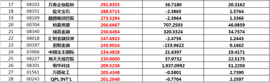 这28只实现翻倍分个股中,市盈率最高的前三位为域高金融(08340)、联旺集团(08217)、中国宝丰国际(03966),分别为2658.46倍、1937.10倍、707.25倍,市盈率最低的为QPL INT‘L(00243)、中达金融集团(00572)、海天天线控股(00572),分别为-153.96倍、-86.64倍、-64.63倍。