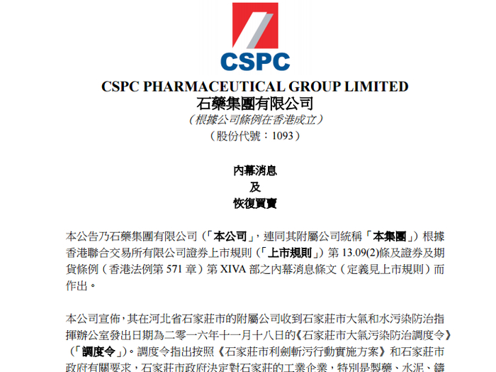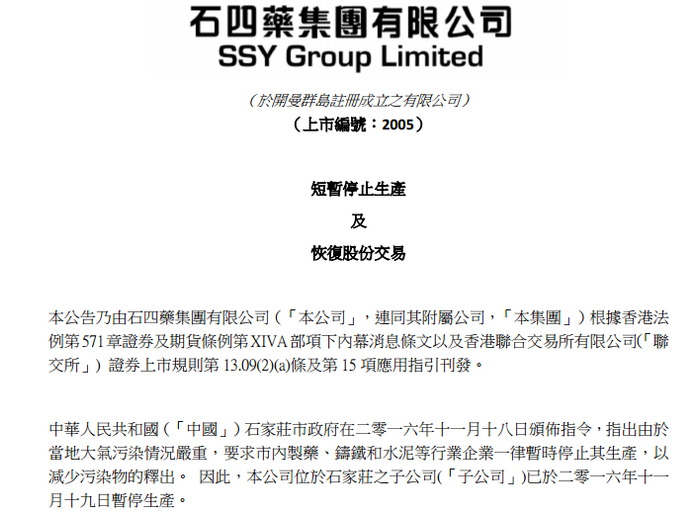 石四药集团表示,石家庄市政府在11月18日颁布指令,指出由于当地大气污染情况严重,要求市内制药、铸铁和水泥等行业企业一律暂停生产,以减少污染物的排放。 因此,公司石家庄的子公司已于11月19日暂停生产。