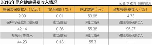 此前,市场对其最大的争议在于,作为一位专业健康险公司,短期的万能险产品却在业务结构中占有重要位置。2016年1-12月,昆仑健康原保险保费收入2.09亿元,市场份额0.01%,同比增速53.68%,占规模保费收入的4.73%;保户投资款新增保费42.14亿元,市场份额0.36%,同比增速55.38%,占规模保费收入的95.27%;规模保费收入44.23亿元,市场份额0.13%,同比增速55.30%。
