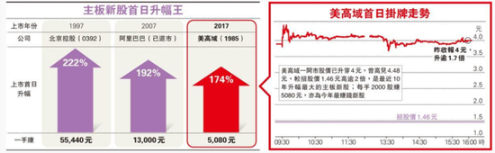 美高域甫开市股价已升穿4元,最高见4.48元,较招股价1.46元高2.07倍,最终收报4元,较招股价升174%,是2007年阿里巴巴(已退市)上市以来,升幅最大的主板新股。美高域每手2000股赚5080元,亦为今年最赚钱新股。上一只首日升幅逾倍的主板新股,是去年7月上市的中国优质能源(1573),首日升1.3倍,不过公司之后被证监会点名股权过度集中。