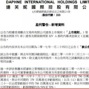 3月3日晚,台资女鞋品牌达芙妮发布最新盈利警告显示,公司预计2016年全年亏损额将高达7.9亿-8.4亿港元。与上年同期的亏损额相比,亏损增幅约为58%至70%。