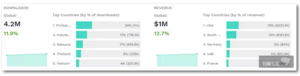 但值得注意的是,该游戏在菲律宾的下载量最高,但是在菲律宾的收入却远不如美国。这与用户平均付费额有关。美国平均用户付费额高达42.66美元,而菲律宾的平均用户付费额仅为15.44美元。