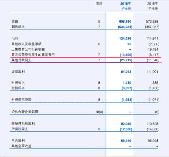 但到了净利润上却比去年同期下滑了27%,主要来自于IPO所产生的费用和行政开支,IPO不需要多说,对于瑞港建设这种资本较重的企业来,融资必不可少。