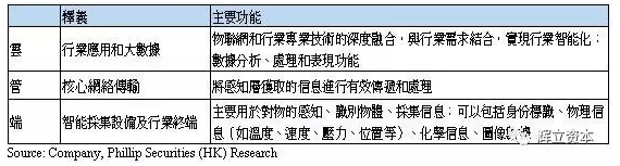物联网架构可分为三个层面:感知层、网络层和应用层。公司为物联网整体解决方案提供商,全面布局云(分析)、管(传输)、端(采集)。以下表格罗列云、管、端的释义和主要功能。