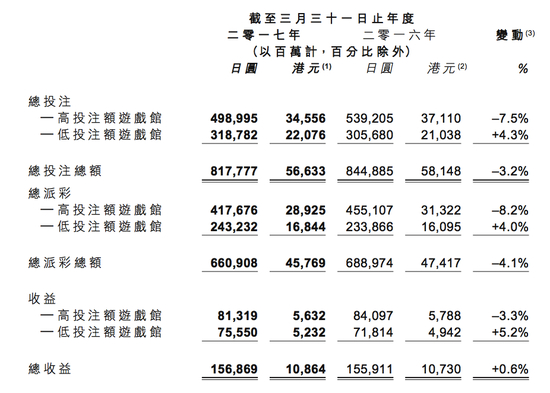 上述期间,该集团的总投注额为8177.8亿。其中,高投注额游戏馆的总投注额为4989.95亿元,同比下降7.5%;低投注额游戏馆的总投注额为3187.82亿,同比增长4.3%。可惜的是后者的增长幅度并未完全抵消前者下降的幅度,DYNAM JAPAN的总投注额仍较去年同期下降3.2%。
