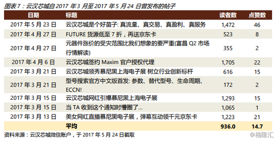 管理层可能会争论指科通芯城是一个 B2B 平台,不能以常识性的标准如读者数目来衡量。因此,为解决科通芯城的顾虑,我们亦总结了云汉芯城(显然同样是一个 B2B 平台)在微信发布帖子的情况: