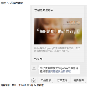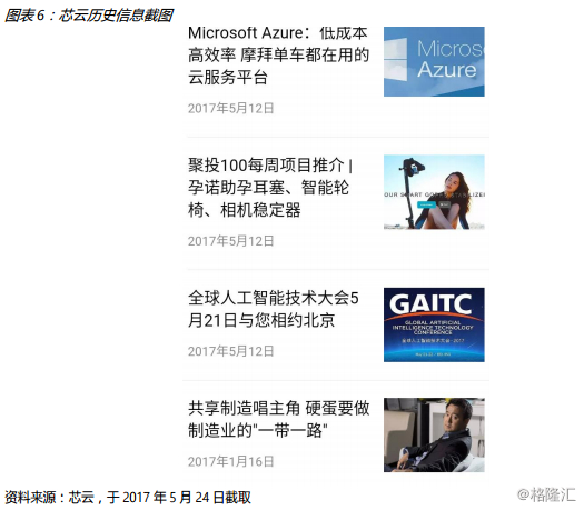 举例而言,我们可在上图中看到该帖子截至 2017 年 5 月 24 日共有 83 名读者。芯云以往曾发布的帖子可在微信账户的历史信息中找到。以下是芯云自 3 月起曾发布的帖子: