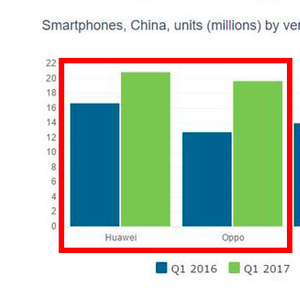 2017年一季度,华为和OPPO继续保持高增速,其中OPPO增速同比大增55%。