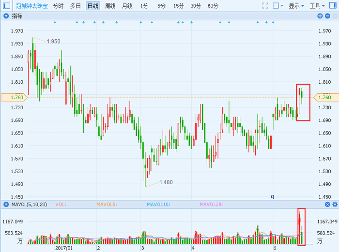 数据显示,当天共2614万港元内地资金进出冠城钟表珠,占其当天总成交额的90%!在内地资金的推动下,该股出现明显的上升行情,全天涨4%,盘中最高见1.79港元,创近5个月新高。