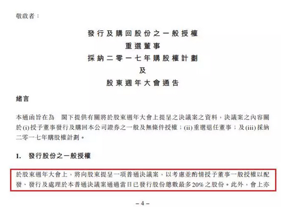 公司于每年股东周年大会时,都会要求股东向董事会作出一般性的授权,允许公司每年增加不超过 20% 的股本。当公司获得股东授权后,便可在年度内进行任何新股发行的活动,只要董事会拟发行的股份百分比不超过股东批准的上限(即20%),便毋需事先获得股东的批准。