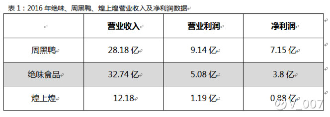 从2016年营业收入及门店数目来看,绝味、周黑鸭、煌上煌位居前三,其中2016年绝味营收32.74亿元,周黑鸭全年营收28.18亿,煌上煌全年营收12.18亿。从净利润上,周黑鸭以7.15亿元排名第一,高于绝味和煌上煌的3.8亿元及0.88亿元。从这组数据看,作为最早登陆资本市场的选手,煌上煌基本已经算是出局了。