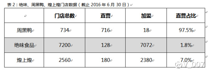 然后再来比较一下这三家的经营模式,其中周黑鸭以直营为主,绝味及煌上煌以加盟模式为主。加盟模式中,通过向加盟商收取加盟费、管理费、保证金等,即可建新店,因此加盟店往往更易于快速铺开;而直营模式中,每一家店面的所有费用都需要自行承担,建店成本高,因此拓展速度和数量不及加盟模式。这也导致了三家企业的门店数存在巨大的差异。