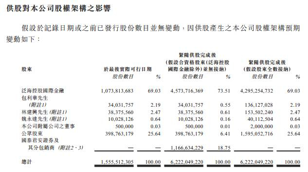 从公告的股权架构图可以看到,现时泛海控股持有69%的股权,旧股东包利华林建兴合共持有2.6%,公众股东为25.6%。假如小股东不供股,泛海控股持股量将去到73.5%,包销商国泰君安包销11.6亿股。