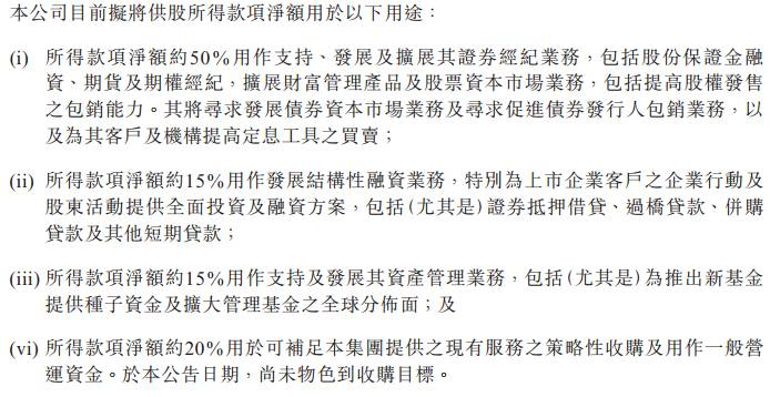 这次供股预计净额为约51亿港元,其中50%用于扩大经纪业务,15%用于结构性融资业务,15%用于资产管理业务,剩余的用于可能收购。
