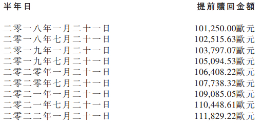 与此同时,在赎回机制上,相关条款也较为“安全”,排除突然间需要全部“还本付息”的情况。如到期赎回:除之前已经赎回、转换或购买及注销者外,发行人将于2022年7月21日按其本金额的113.23%赎回每份债券;提前赎回金额:提前赎回金额=过往赎回金额x(1+r/2)d/180。简单理解,提前赎回金额将分批维持在10万欧元上下,期内不会陡然增加。