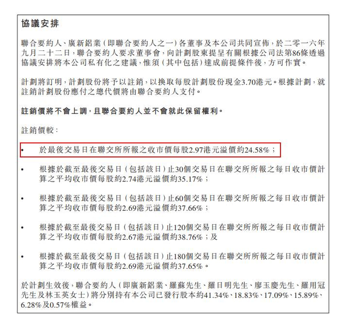 刚刚就说过2014年私有化失败的关键就是二股东嘉新水泥否决方案,嘉新水泥突然减持不再成为公司核心关连人士,明显是为了未来私有化安排。今年4月台泥国际再次获大股东提私有化价格为3.6港元,要约价比第一次要约价低0.3港元。