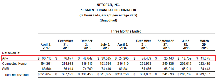 下图为NETGEAR 2017年第一季报告,Arlo为NETGEAR旗下网络摄像机产品系列。Arlo 2017年前3个月的收入为6,000万美元(相等于4.05亿元人民币),同比上升4.4倍,可见Arlo的产品仍在处于增长期。