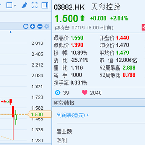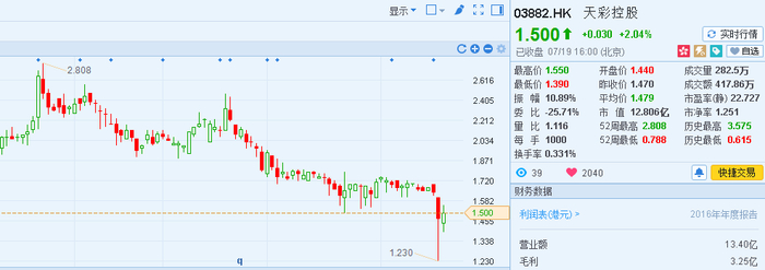 天彩控股股价受盈警拖累,7月18日盘中最高跌幅达到25%,其后收盘价为1.47元,下跌10.4%。