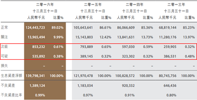 其中可疑等级的不良资产增长最明显,已经达到5.36亿,占比0.38%,同比增长37.7%。