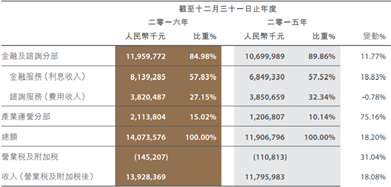 公司于2016年度获得营收近139亿元,同比增加18%,主要贡献是最大块的利息收入增加18%,已经产业运营部分增长近75%,咨询服务收入则略微降低。