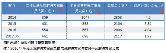 实际上,高阳科技表现该收入结构的变化,跟它历年的资源调整有着非常大的关系。智通财经APP翻阅高阳科技2014年报发现,它的行政费用较高,2014年行政费用就达到了4.2亿港元,占比收入达27%,该公司亦在人力资源上做出了一些调整。我们可以发现,高阳科技把人力资源都靠拢核心业务,三年半来,该业务员工增加了302人,增长84.1%。