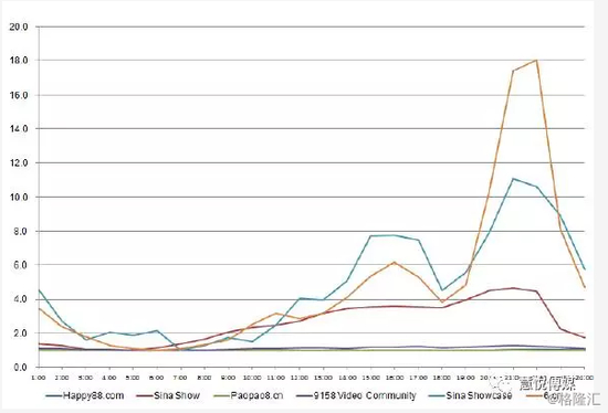 从峰值和谷值用户数对比来看,欢乐吧和心意吧几乎没有变动,这并不符合一般情况下看直播用户的习惯。与之呈对应,六间房(图中橙色)的数值则比较正常。并且,Emerson发现欢乐吧的用户和主播之间几乎没有互动,由此判断欢乐吧的用户大多数为僵尸粉!