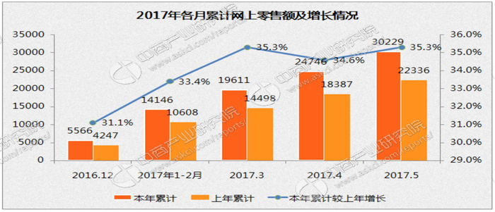 据中商产业研究院统计的数据显示,2016年12月至2017年5月,我国网上零售额总额达到30229亿元,首次在连续六个月内突破3万亿,相比上年同期增长35.3%,为中国电商零售同期的最高纪录。其中,实物商品网上零售额23272亿元,服务网上零售额6957亿元。