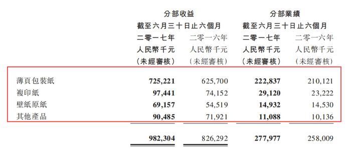 根据优源2017年中期业绩报告显示,公司2017年上半年实现营业收入9.82亿元人民币(若无说明,单位下同)。其中薄页包装纸收入7.25亿元,占比73.83%,复印纸和壁纸原纸占比分别为9.92%和7.04%。